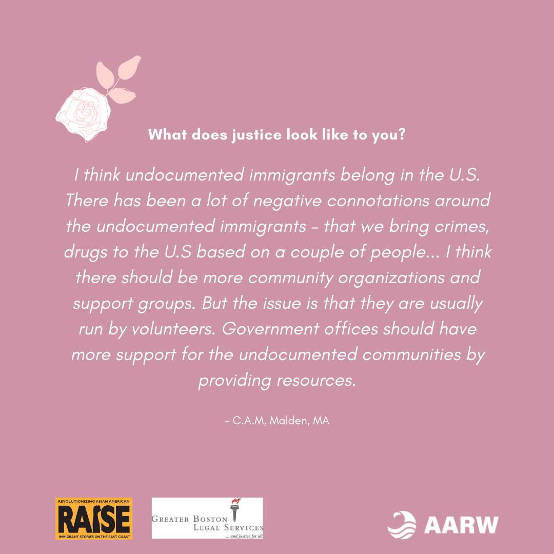 “I think undocumented immigrants belong in the U.S. There has been a lot of negative connotations around the undocumented immigrants – that we bring crimes, drugs to the U.S based on a couple of people... I think there should be more community organizations and support groups. But the issue is that they are usually run by volunteers. Government offices should have more support for the undocumented communities by providing resources.