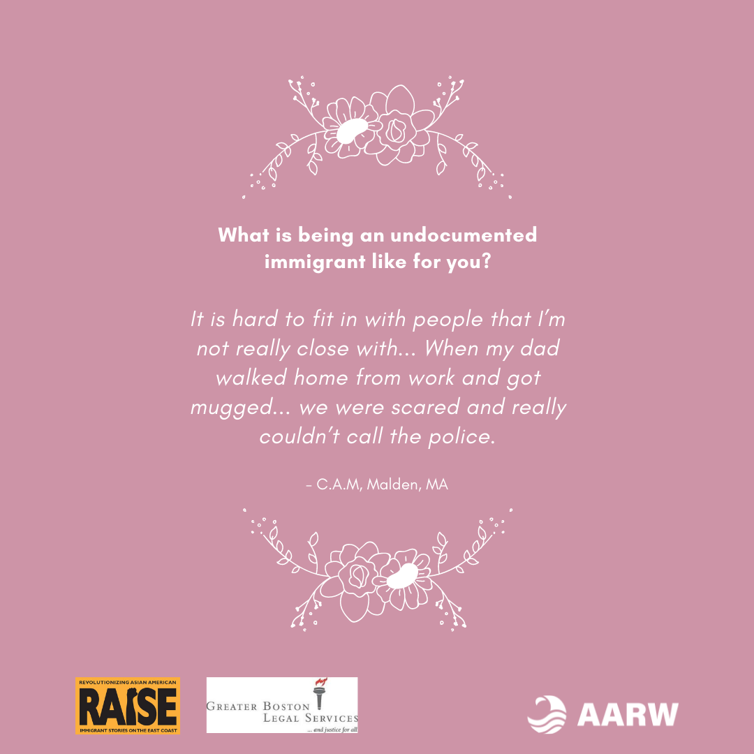 “It is impossible to find a job and without a driver’s license, it’s hard to go anywhere, including getting groceries. A lot of my friends know that I’m undocumented, they still treat me the same, they didn’t treat me differently. But it is hard to fit in with people that I’m not really close with... When my dad walked home from work and got mugged... we were scared and really couldn’t call the police. I don’t think the police are bad. I think if I am a citizen, I wouldn’t mind calling the police but because I am undocumented, I can’t.”