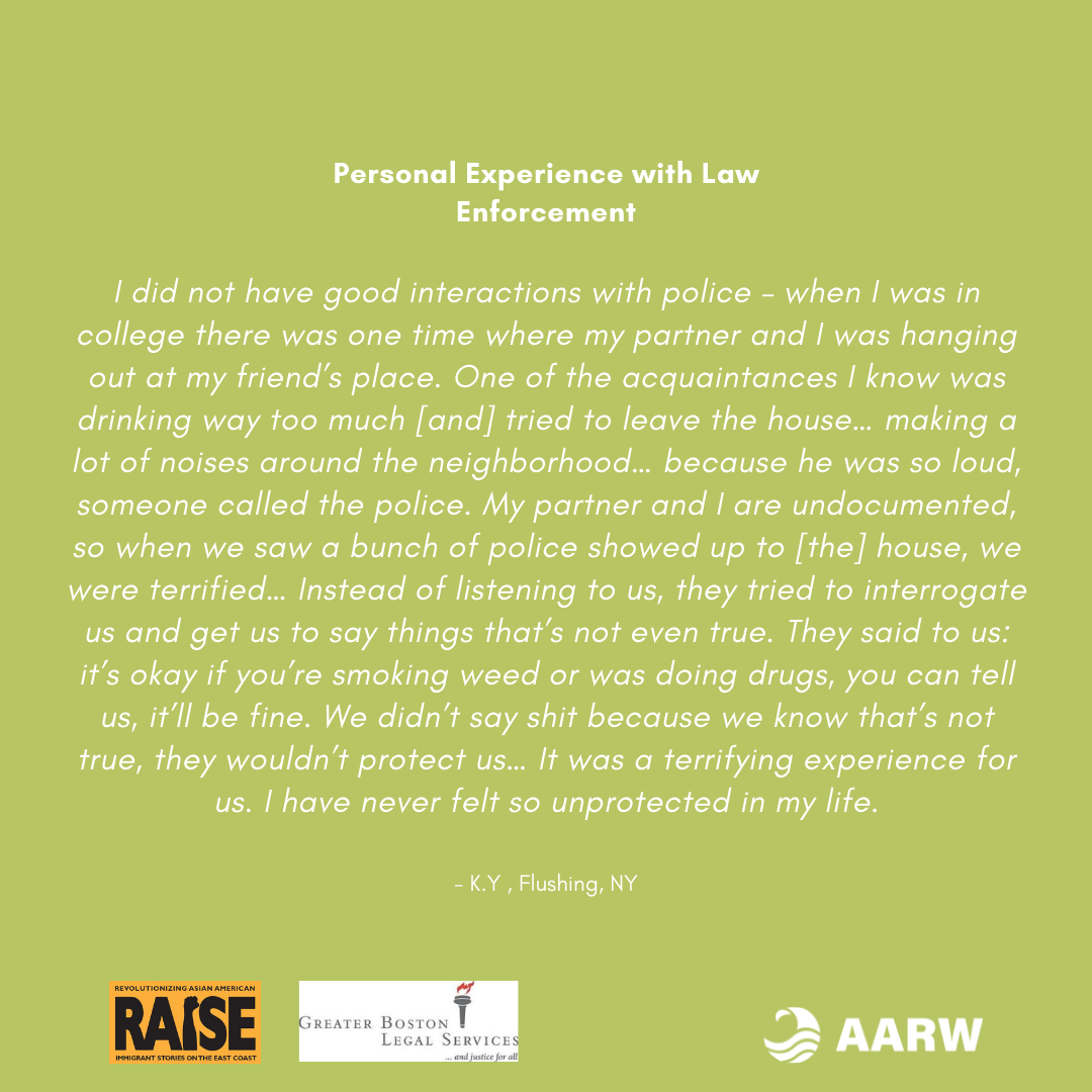 My partner and I are undocumented, so when we saw a bunch of police showed up to my friend’s house, we were terrified. We explained to the police what happened but instead of listening to us, they tried to interrogate us and get us to say things that’s not even true. They said to us: it’s okay if you’re smoking weed or was doing drugs, you can tell us, it’ll be fine. We didn’t say shit because we know that’s not true, they wouldn’t protect us. I’m DACA, so I have some form of protection but if we get arrested, my boyfriend who is completely undocumented, he has no protection at all... It was a terrifying experience for us. I have never felt so unprotected in my life.”