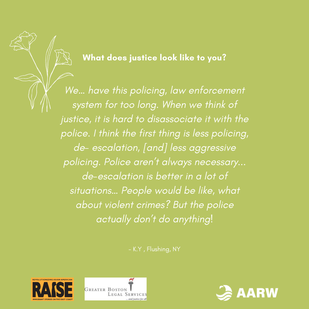 “I’m not quite sure what justice looks like. We always have this policing, law enforcement system for too long. When we think of justice, it is hard to disassociate it with the police. I think the first thing is less policing, de- escalation, less aggressive policing. Police aren’t always necessary most of the time. De-escalation is better in a lot of situations. A lot of people would be like, what about violent crimes? But the police actually don’t do anything! I don’t know what could replace it. Justice has been set up disadvantageously to the marginalized group. I don’t think I have a concrete answer. but I think less policing and de-escalation is probably a good way to start. I just want more safety. For all groups of people, not just certain groups. My experience who is East Asian, DACAmented, immigrant is different than those who are brown, black or in other communities, what could work for me might not work with others. ”