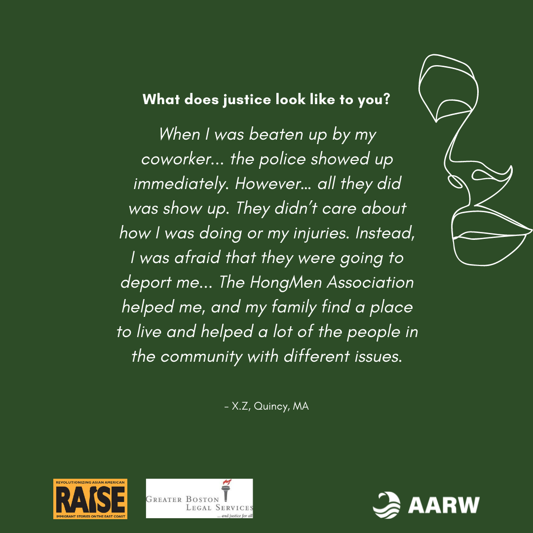 “When I was beaten up by my coworker... the police showed up immediately. However, they didn’t really do much, all they did was show up. They didn’t care about how I was doing or my injuries. Instead, I was afraid that they were going to deport me... The HongMen Association helped me and my family find a place to live and helped a lot of the people in the community with different issues. The Chinese Progressive Association also supported me a lot here, also helped me find Greater Boston Legal Services to assist me with Legal issues. I felt really comfortable in this community and have always been this way for the past 20+ years.”