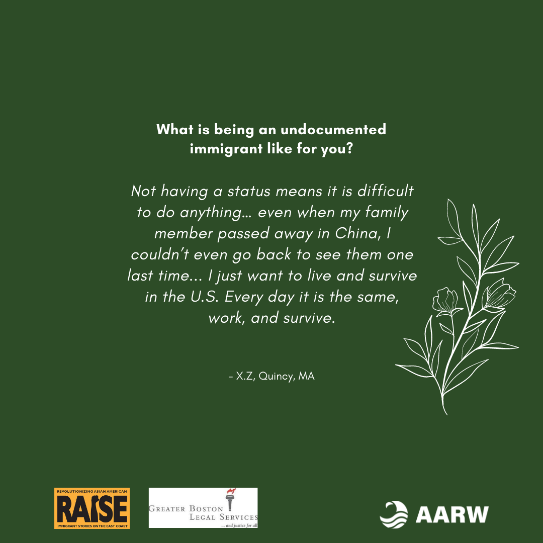 “I migrated to the U.S. because of China’s family planning policy. My family gave birth to more than one child, so I had to leave China. When I arrived, I hoped to receive asylum protection... but it was later denied... Not having a status means it is difficult to do anything. It means I can’t travel, and even when my family member passed away in China, I couldn’t even go back to see them one last time... It was hard to speak to anyone outside of Chinatown. I just want to live and survive in the U.S. Every day it is the same, work, and survive, even if I don’t have status, I still pay for taxes. No matter if it is only a couple of hours, I still pay my taxes.”